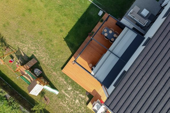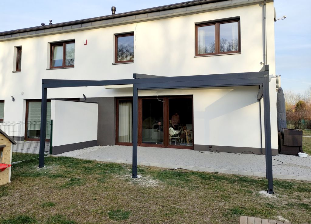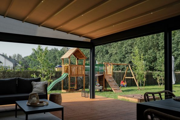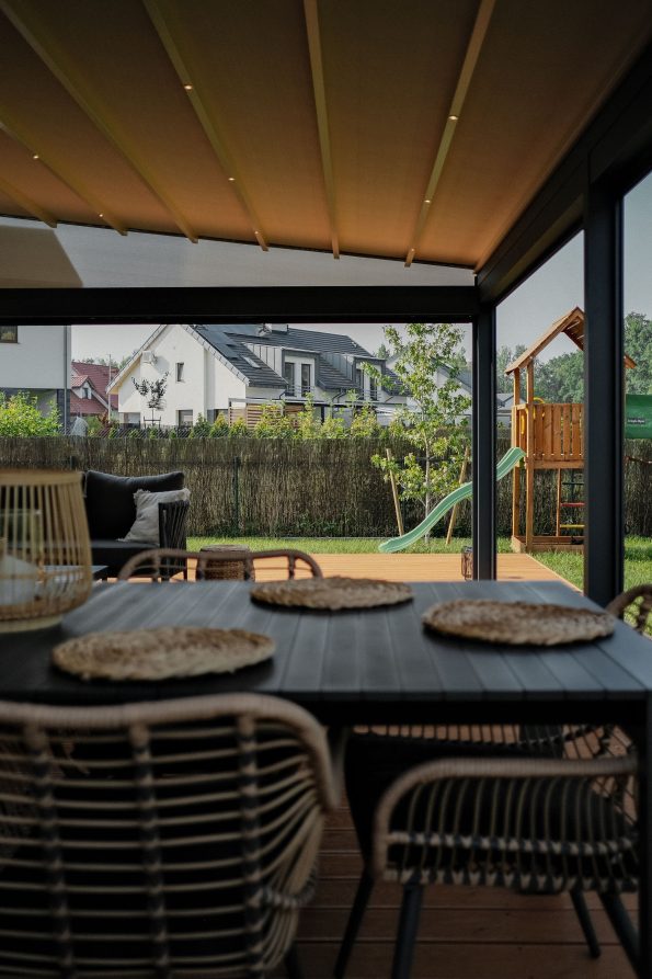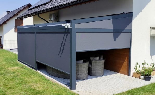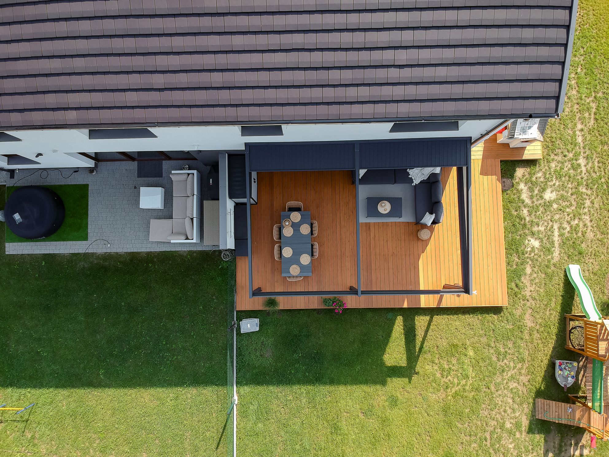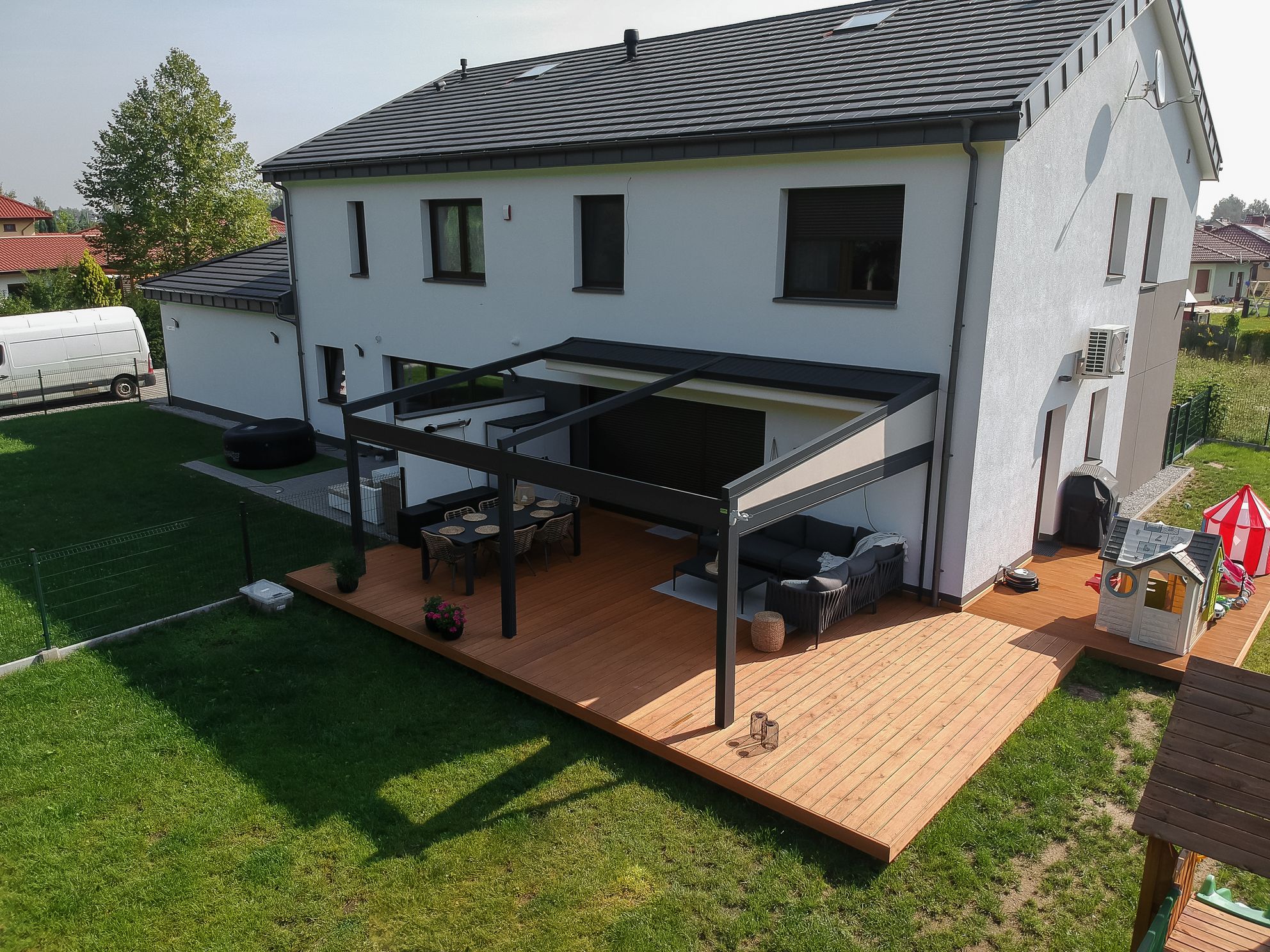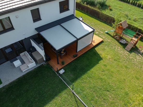 Eine spektakuläre Lösung für Terrassenüberdachungen. Der vollständig gespannte Stoff und das horizontale Vordach passen perfekt in Ihr Haus.