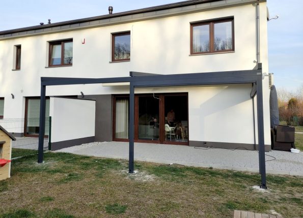 Die Pergola wird an der Wand montiert. Diese Art der Montage ermöglicht es Ihnen, den Raum auf effektivste Weise zu nutzen.